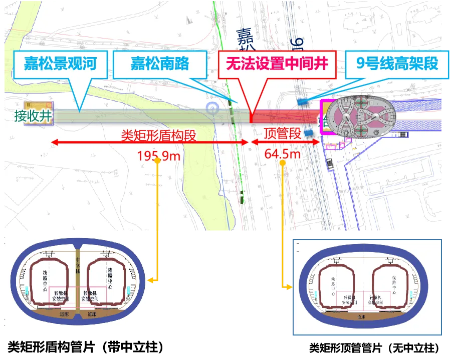 上海市轨道交通12号线西延伸工程洞泾站周边环境极为复杂。洞泾站站后折返线总长266.6米,沿线依次穿越9号线高架桥桩、嘉松南路、7号湾水管升拔区、嘉松景观河等,最后接入接收井。