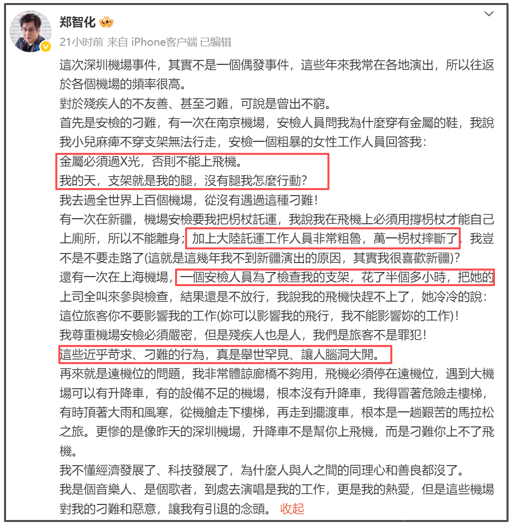 然后最重要的一步,就是郑智化又发了第三篇控诉,这次直接大吐槽内地机场的安检,称不够人性化云上速配,自己经常被刁难和苛待。他举例称在南京机场被询问“为什么穿有金属的鞋”,只能尴尬回应安装了“金属支架腿”;还有在新疆过安检被要求托运拐杖,这些都让他感受到机场安检缺乏同理心和善良,让他萌生退意。