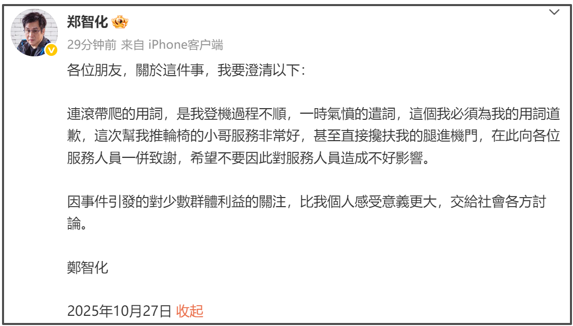 10月27日,郑智化在控诉深圳机场引发争议之后,面对舆论翻车的情况,他本人火速发文道歉。郑智化表示:“连滚带爬的用词,是我登机过程不顺,一时气愤的遣词,这个我必须为我的用词道歉,这次帮我推轮椅的小哥服务非常好,甚至直接搀扶我的腿进机门,在此向各位服务人员一并致谢,希望不要因此对服务人员造成不好影响。”