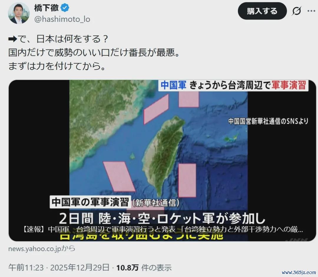 极右派大佬,“日本维新党”创始人桥下徹在其个人X账号上,转发并评论解放军宣布军演的新闻。