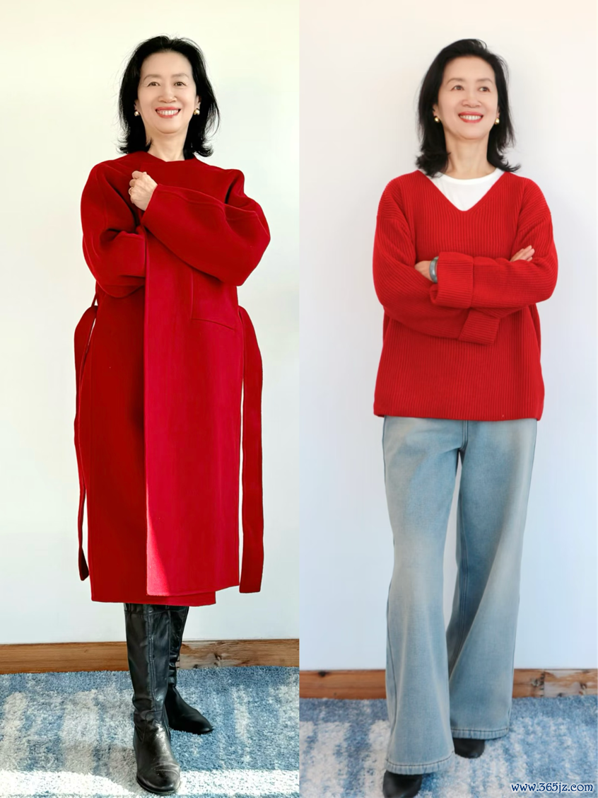 如果想尝试亮色,不用大面积使用,作为小面积点缀就好。比如上半身穿红色,下半身搭配蓝色牛仔裤,冷暖结合可以打破沉闷,又不会显得浮夸,还能增添活力感,让无龄感更突出。