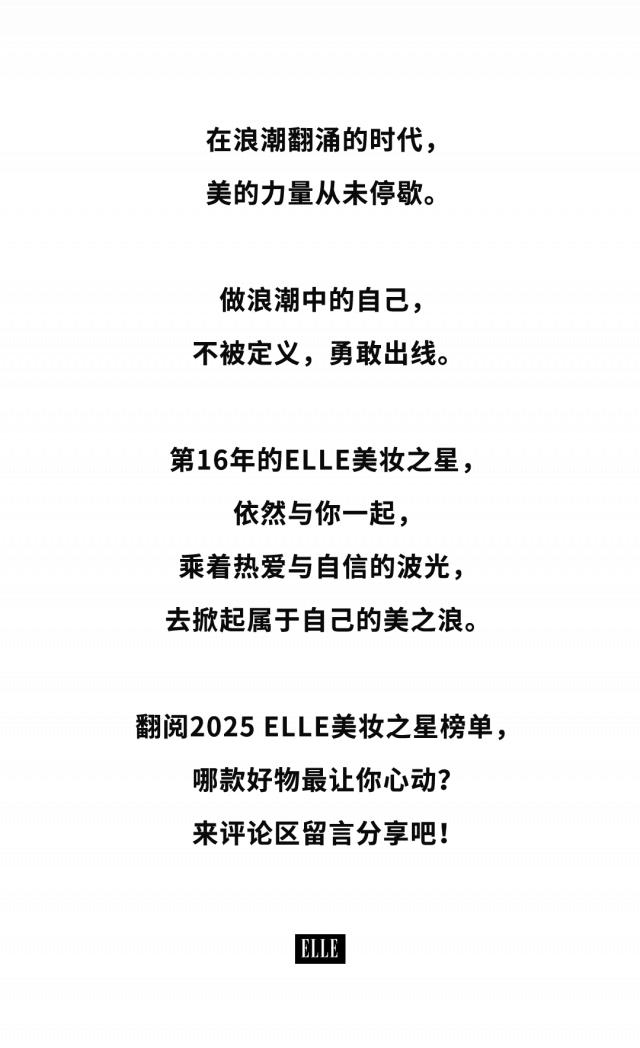 2025年,ELLE依旧以专业为舵、热爱为桨,与先锋品牌并肩扬帆浪尖,探索美的无限可能。从高能修护黑科技,到新锐妆容流派,再到兼顾身体与心灵的"共振养护",每一款甄选星品,都是趋势与态度的最佳注脚,共同勾勒出新一年的美妆语境。此刻,我们诚挚邀请大家,一同揭晓2025年度榜单的星品实力!